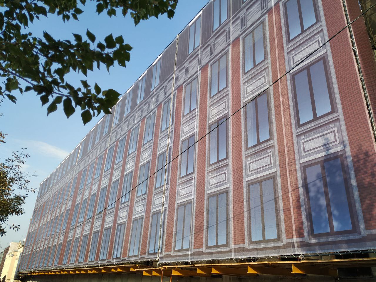 Монтаж фальшфасада выполнялся с применением специализированного оборудования и технологий промышленного альпинизма.